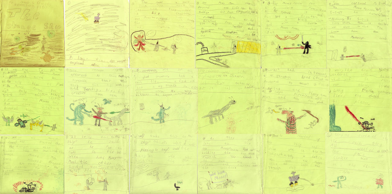 I took my first stab at writing a book in November 1980. I called it The Strange Ship. I was very excited to finish it. Remembering childhood is tricky, but I vividly recall laying on my bedroom floor, drawing the cover. I carefully traced around a quarter to make sure the planets were round.