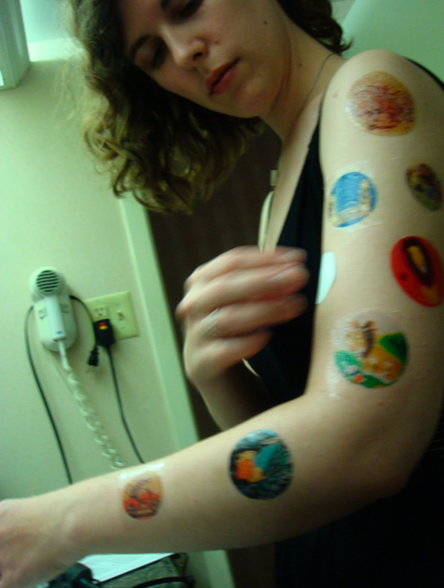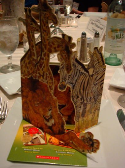The programs for the Newbery / Caldecott award banquet are often done in the style of the Caldecott winner, and this year’s was a real stunner, a beautifully illustrated book in its own right. Betsy Bird also has a tradition: temporary body art inspired by the Newbery and Caldecott winners! Below: program on left, Betsy on right. Check out Betsy’s complete description of her tattoo strategy here.