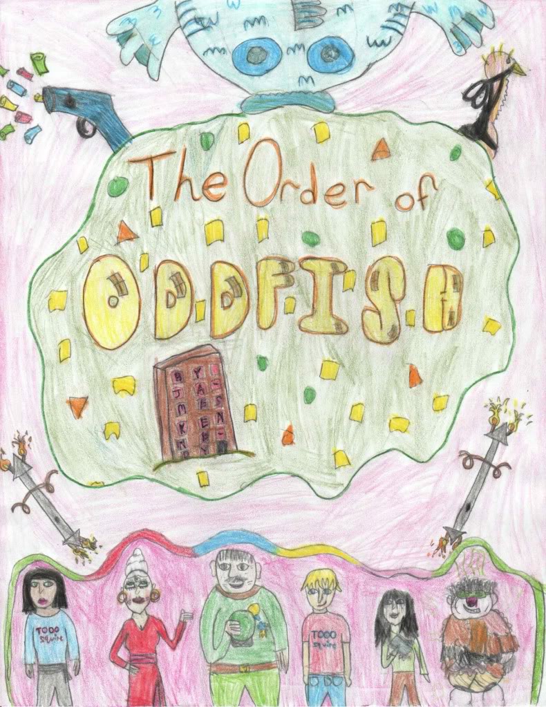 As a birthday gift, my protegee Freya made a special limited edition of Odd-Fish. This is her cover for it. I love the multicolored apologies whizzing out of the Apology Gun, the flaming double-sided lances, and how the fish is vomiting out the title! Along the bottom are Jo, Aunt Lily, Colonel Korsakov, Ian, Nora, and the Belgian Prankster. This is possibly my favorite Odd-Fish thing Freya has done, next to her Lily Larouche rap.