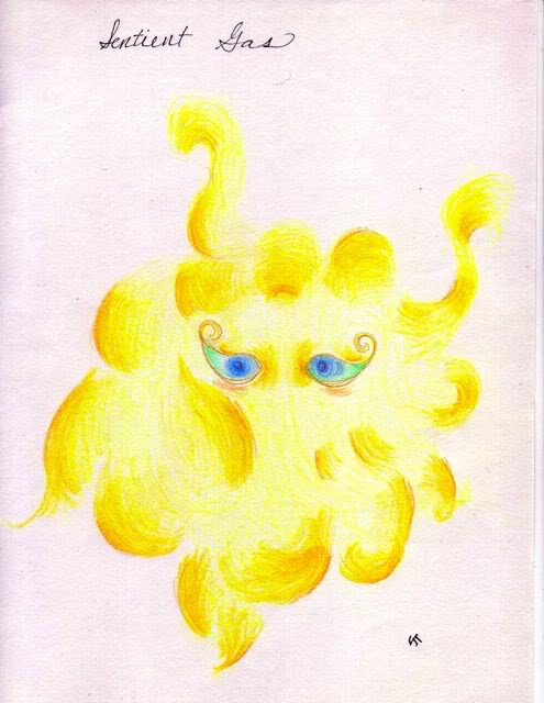 On the left, from The Magnificent Moots, is Feepness Moot, a sentient gas from Saturn. On the right, the flaming double-sided lance that is the discriminating knight’s weapon of choice in The Order of Odd-Fish. Both highly accomplished illustrations. I love the dynamic shading of the gas and the elegant swirl of the eyes in Feepness. Shelly’s inspiring me to finish editing this book, to justify the art!