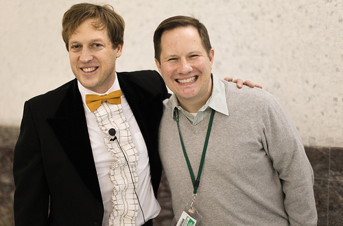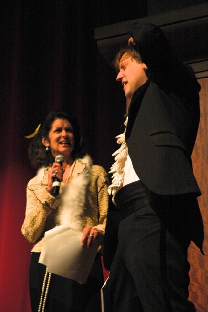 Thanks to my co-host for the evening, Blue Balliett, bestselling author of Chasing Vermeer and other children’s books (including the upcoming Hold Fast, which I loved!). Blue was everything I could’ve asked for in a co-host, from her able banter right down to her glamorous gown, which had a black-and-white stole that was itself a sly Chasing Vermeer reference! Here we are singing the 90-Second Newbery theme song (b’garg, nobody videotaped it in Chicago! But here’s what it sounded like when Jon Scieszka and I sang it at the New York screening):