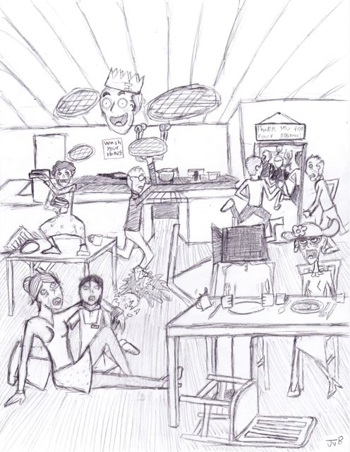 The picture of Jo’s room also nails exactly how I imagined it (bonus: out the window, you can see Dust Creek behind the highway). Same with the raucous madness of the Dust Creek Cafe picture—it’s got everything, Mrs. Horpness hurling waffles, Jo helping Aunt Lily, Mrs. Cavendish sternly chastising Mr. Cavendish (I love Mrs. Cavendish’s flower sun hat!) even as his head flies around the room, and all the old people running pell-mell for the doors—exactly what I was hoping to express in that scene. Well done!