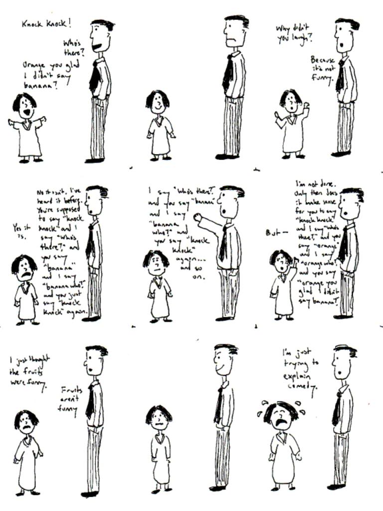 I was honored to be asked to contribute a joke-and-illustration in a book that also featured the likes of Lemony Snicket, John Scieszka, …. Here’s what I didn’t realize, though: almost every single other contributor—including bona fide artists—only used one page of the book, or a double-page spread max. For some reason I drew this excessively long meta-joke above (based on a conversation that my 5-year-old Lucy Momo and I had) and it took up 8 pages. Ay yi yi.
