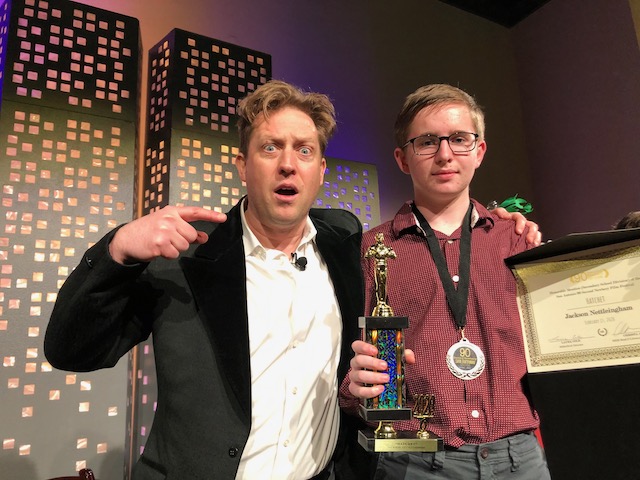 There was also an honorable mention from the high and middle school category that I want to highlight, and it’s an adaptation of Gary Paulsen’s 1988 Honor Book Hatchet by Jackson Nettleingham of Katy, TX. Here I am with Jackson when he’s receiving his award: