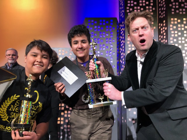Second place for the middle and high school category went to Juárez Elizarraraz of the Advanced Learning Academy for his brilliant and resourceful one-man show version of Avi’s 2003 Medal Winner Crispin: The Cross of Lead. Here he is with his brother Galileo, who won an honorable mention in the elementary section for his animated movie of Fred Gipson’s 1957 Honor Book Old Yeller. (Juárez also helped out in the opening skit, which I’ll get online as soon as possible!)
