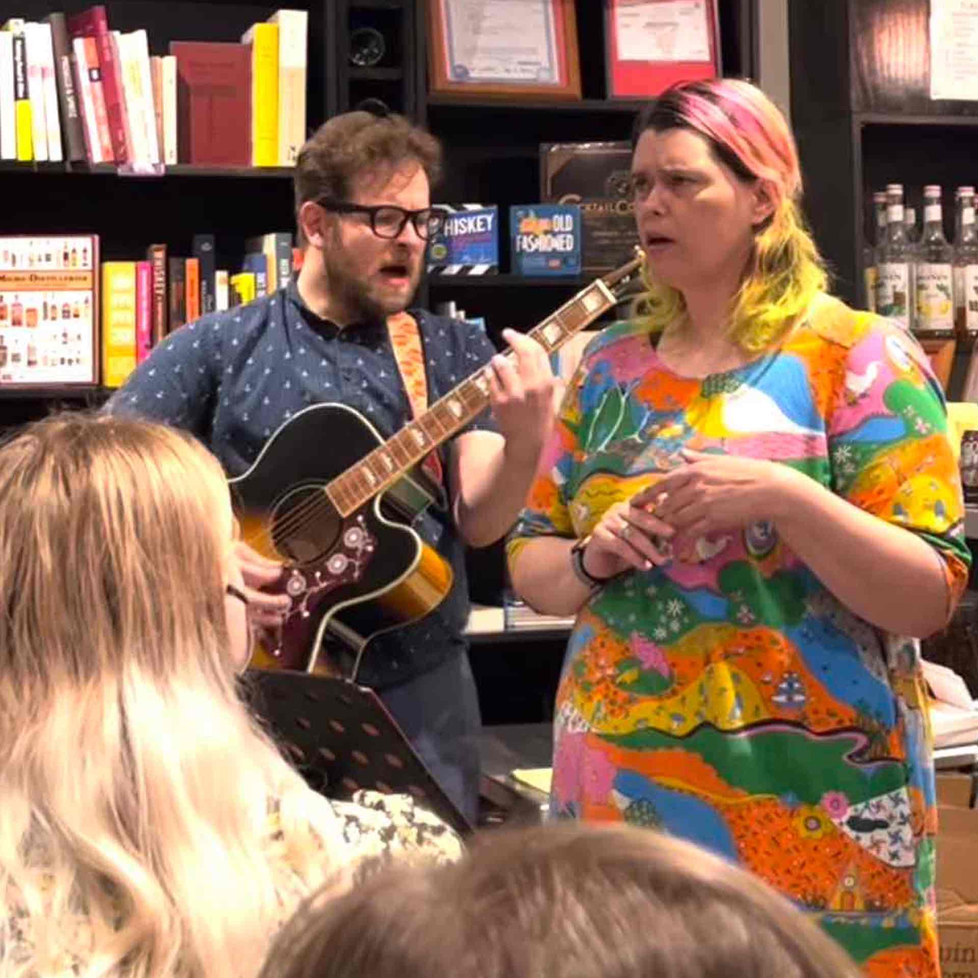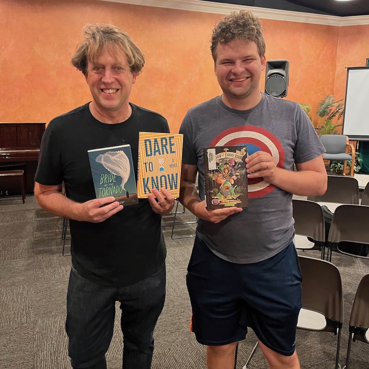 I started my mini-tour at Schuler Books in Grand Rapids. They have a beautiful event space in the back, and Elizabeth, Alana, and Indigo were very supportive hosts. My favorite thing, though, was meeting Josh, an Order of Odd-Fish fan from way back who has also read Dare to Know! It made me feel like I wasn’t shouting into the void after all. He’s a writer too—he has fiction coming up in The MockingOwl Roost, and I’m looking forward to his planned novel about “the Divine Comedy meets Jeeves & Wooster books.” Here we are—that’s right, he’s got an old-school library-binding copy of Odd-Fish: