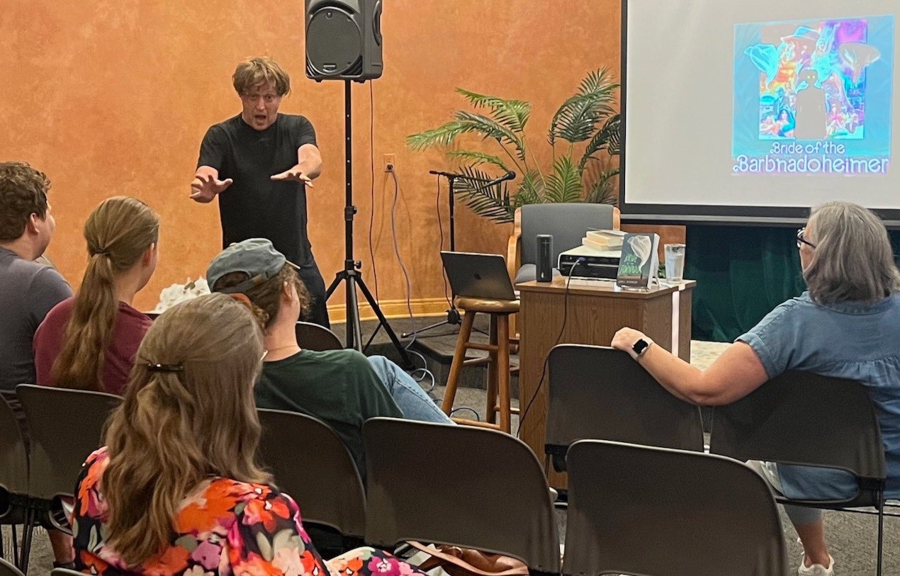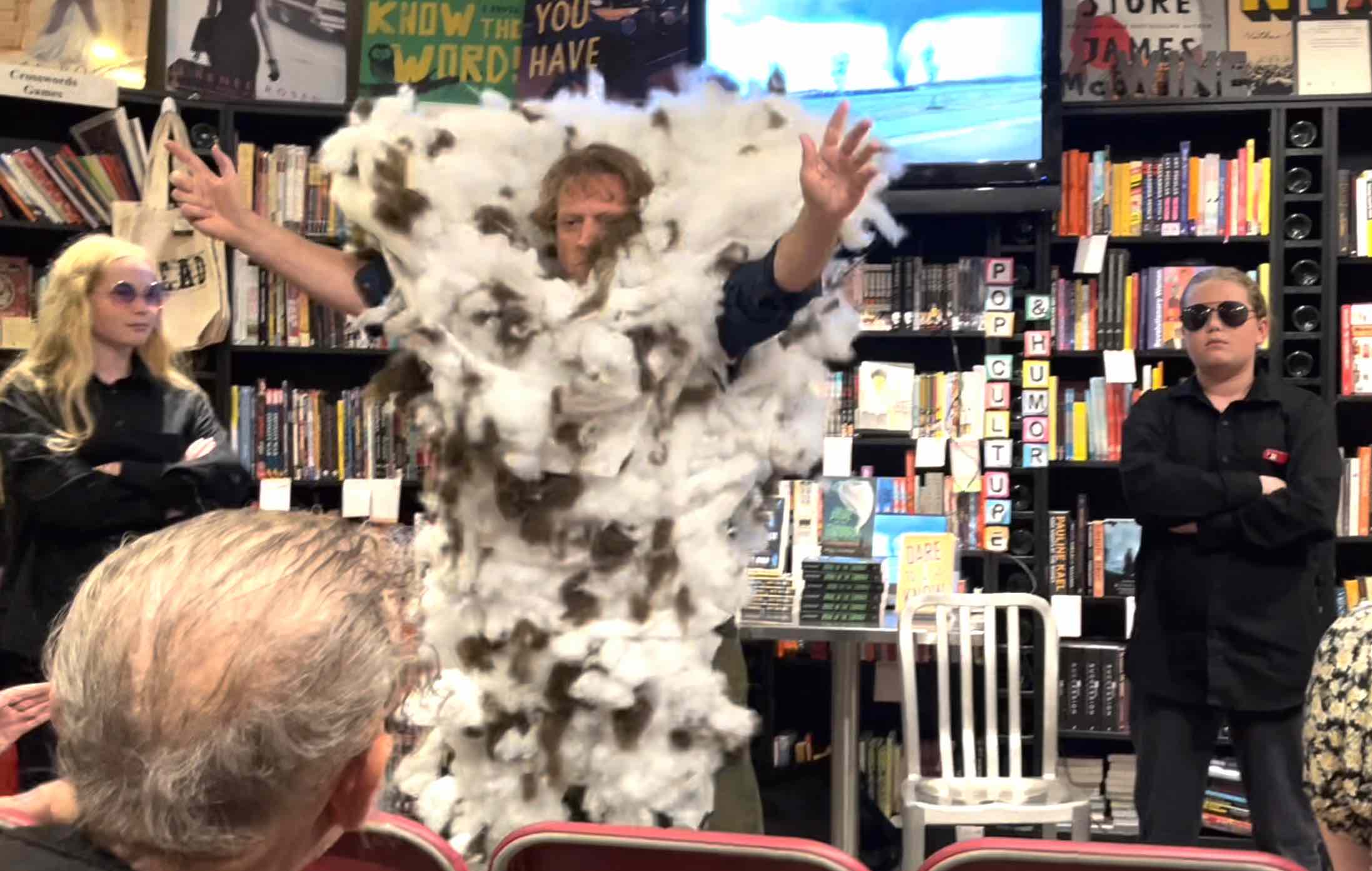 At every stop I came charging out in my tornado costume, sang “Rock You Like A Hurricane” with the lyrics rewritten to explain the plot of the book, then did some readings from the book, with a “tornado trivia contest” throw in for fun: