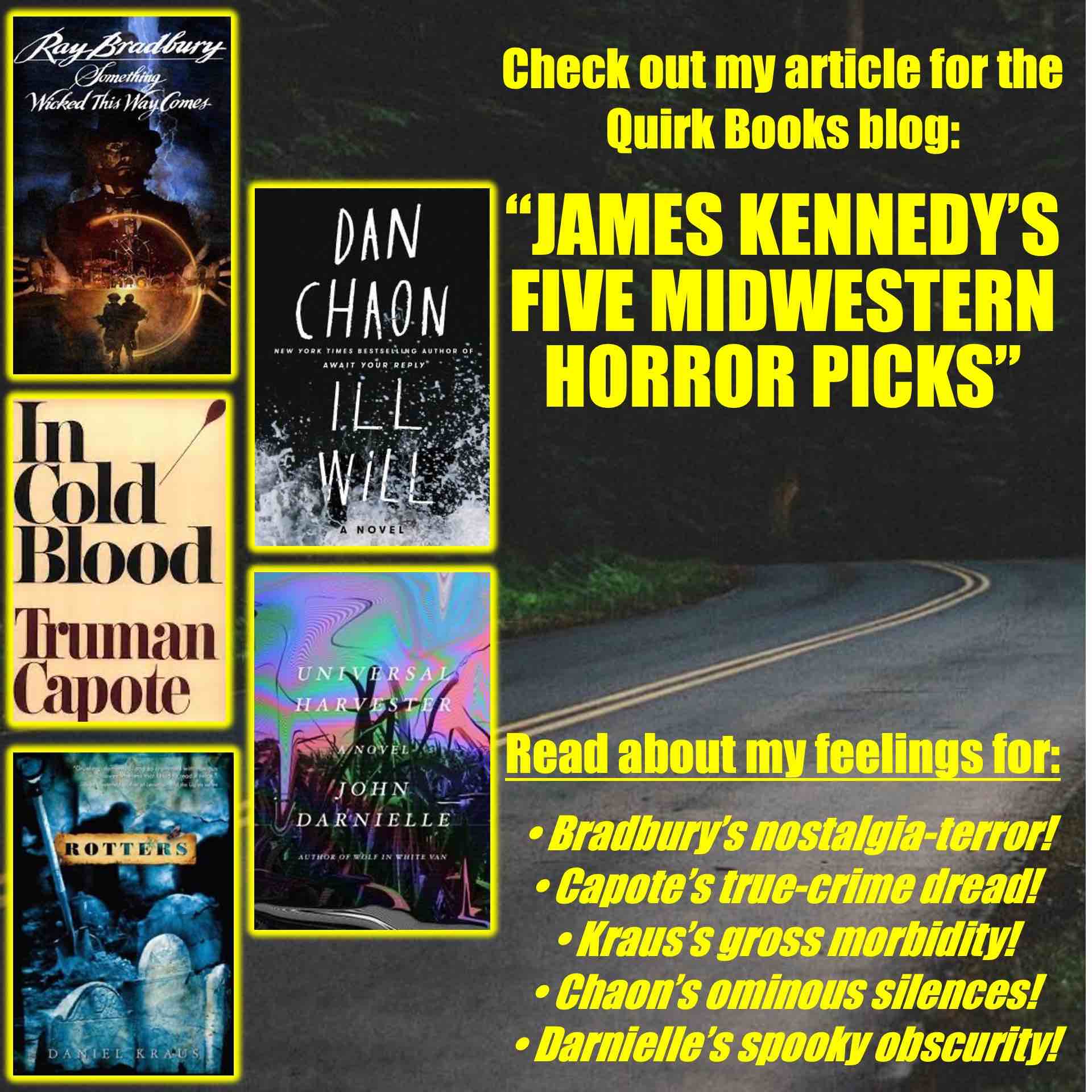 Hey, I wrote an article about my “Five Midwestern Horror Picks” for the Quirk Books blog! I talk about my love for Ray Bradbury’s Something Wicked This Way Comes, Truman Capote’s In Cold Blood, Dan Kraus’s Rotters, Dan Chaon’s Ill Will, and John Darnielle’s Universal Harvester.. You can read the article here.