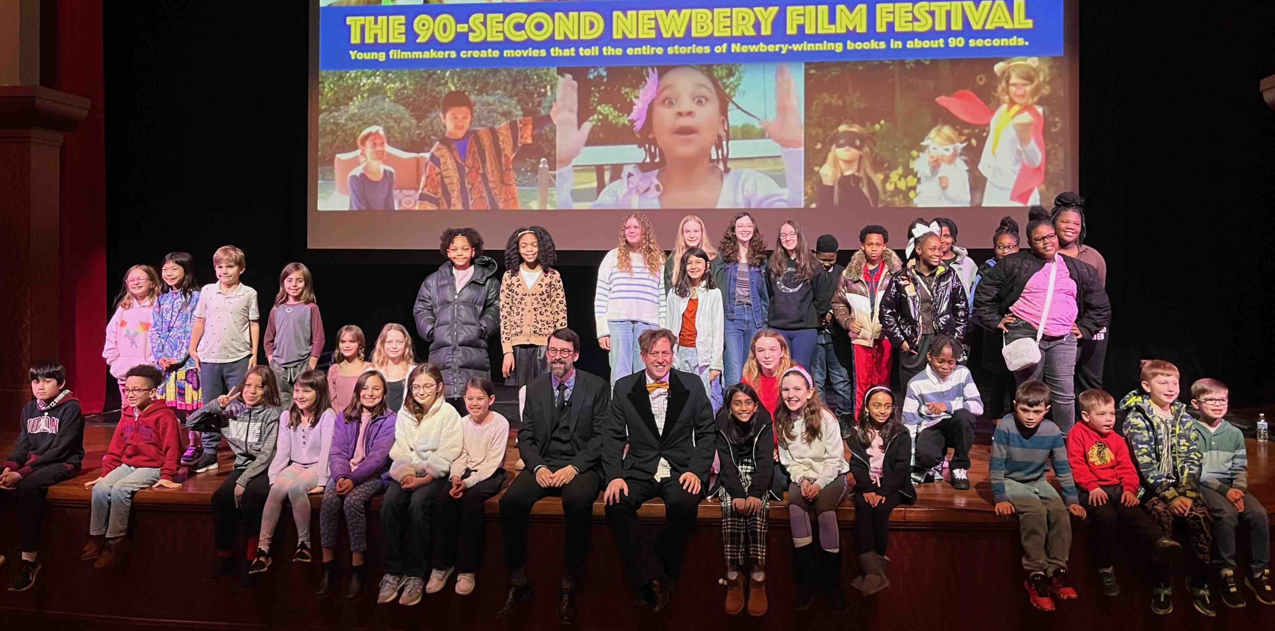 On Sunday—my birthday, as it happens!—we had the Chicago screening of the 14th annual 90-Second Newbery Film Festival. My co-host was my usual partner-in-crime Keir Graff, author of The Tiny Mansion and many other great books for kids and adults. Check out the opening song above, with our own debased version of “The Phantom of the Opera,” in which Keir and I leap off the stage and harass the audience!